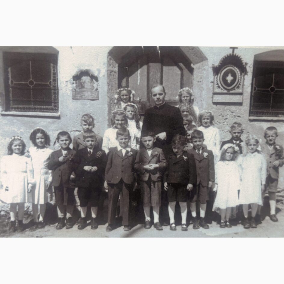 Eine besondere Aufnahme haben wir von Dr. Hermann Arnold, oder wie er in Sölden freundlich genannt wird, dem „Koasrar“, erhalten. Es zeigt die Erstkommunikanten von Sölden gemeinsam mit dem Kooperator Anton Ortner. Nach den schweren Kriegsjahren hatte dieses Fest besonders Gewicht.